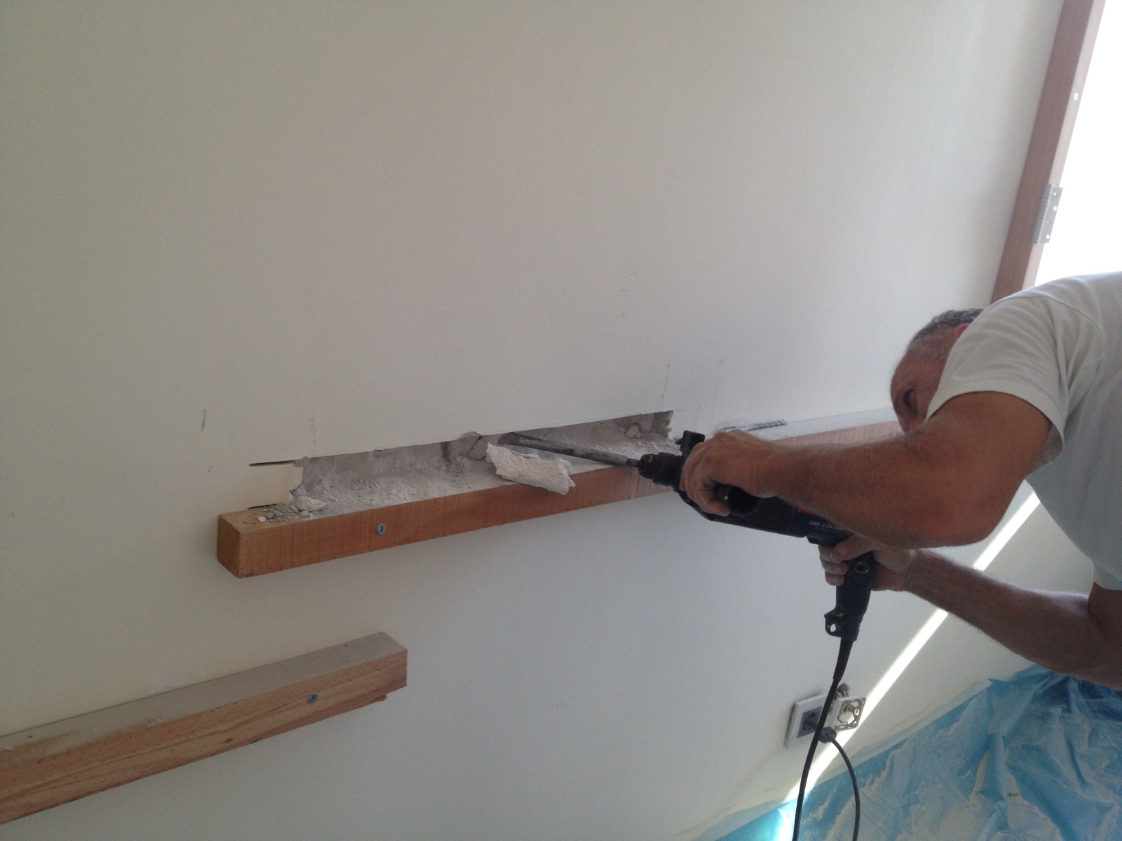 Plak rafı plakların derinliğinin fazla olması nedeniyle diğer rafın yüzeyine uyum göstermesi için duvara sabitlenip lambrilerin yüzeyinden derine konumlandırıldı.